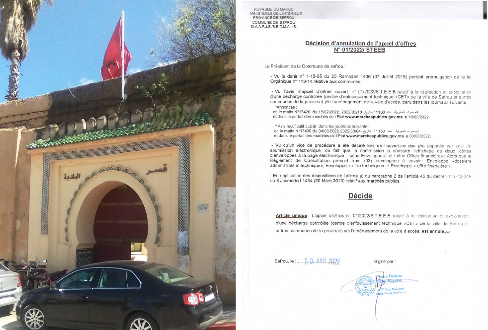 قبل إنعقاد الدورة الاستثنائية ليوم 21ابريل 2022 للموافقة على تمديد مدة عقد التدبير المفوض لمرفق النظافة وجمع النفايات المنزلية بمدينة صفرو،كانت رئاسة المجلس قد وقعت قرارا يقضي بإلغاء طلب عروض متعلق بتدبير مطرح نفايات مراقب توصلت الجريدة بنسخة منه مع ما يعنيه ذلك من إستمرار العمل بالمطرح العشوائي الغير المراقب إلى أجل غير مسمى!!